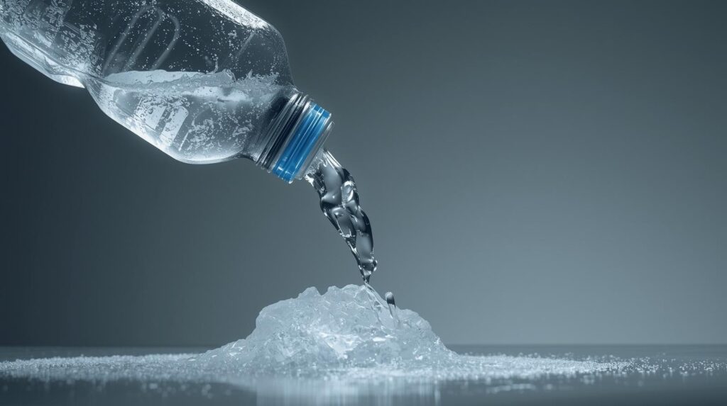 上図のように、過冷却水が何かに衝突した途端にその衝撃でシャーベットアイスに変わります。